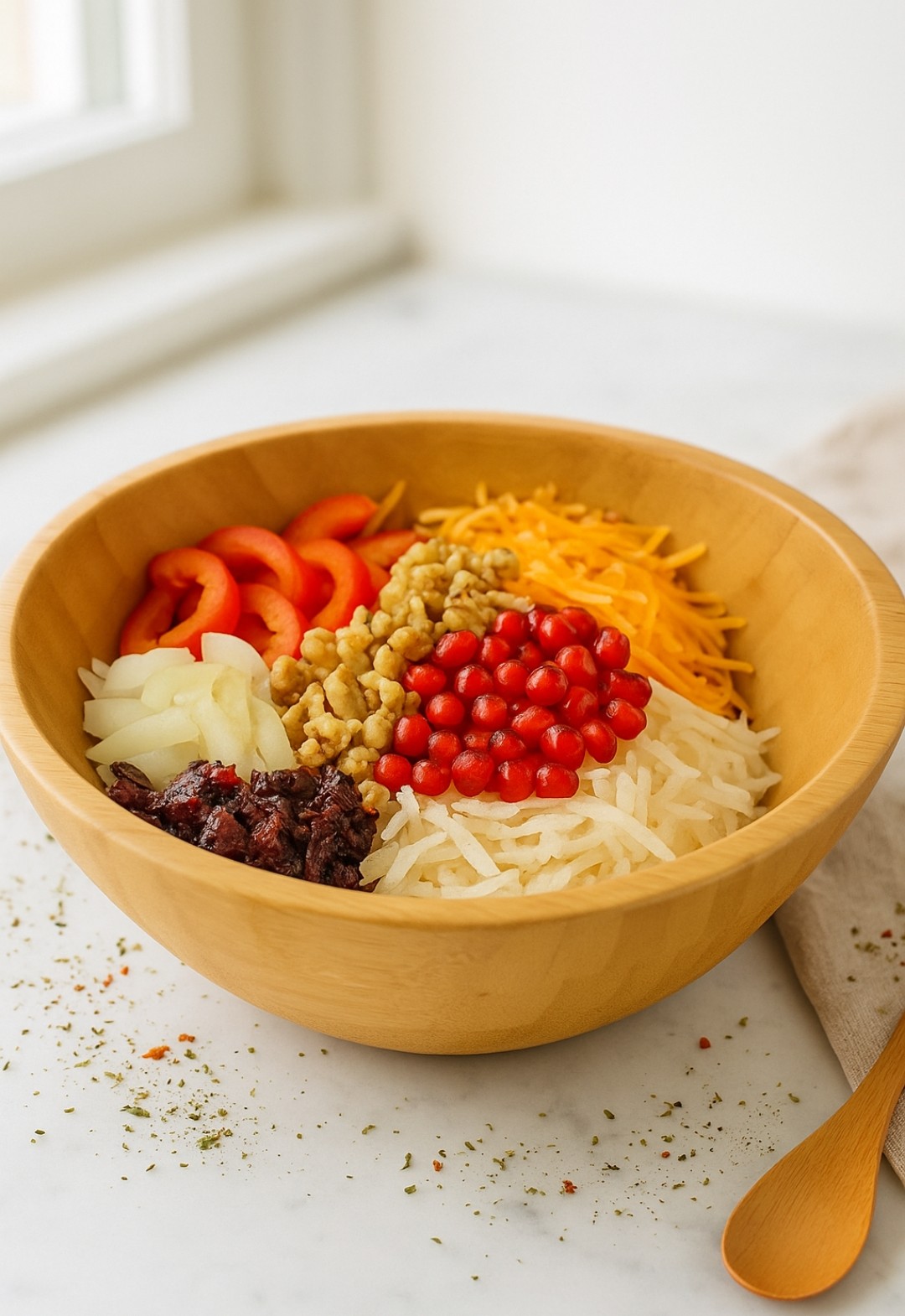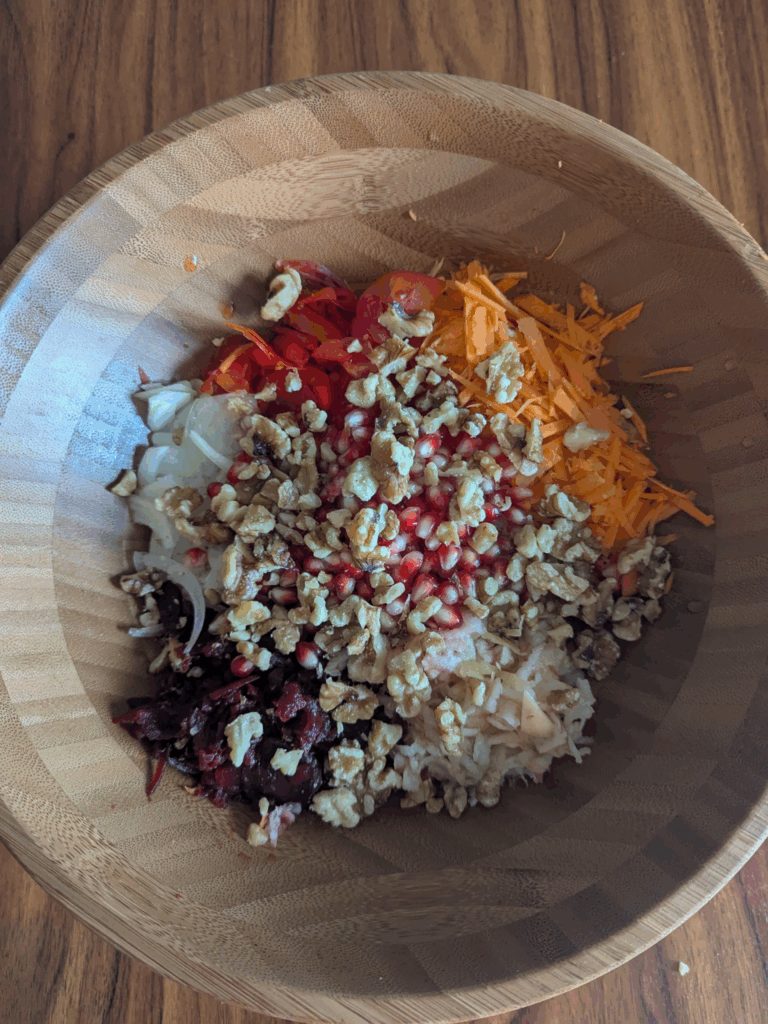 - Alles vermengen: Gemüse, Granatapfelkerne, Dill und Walnüsse in einer großen Schüssel mischen, Dressing darübergeben und leicht durchziehen lassen.